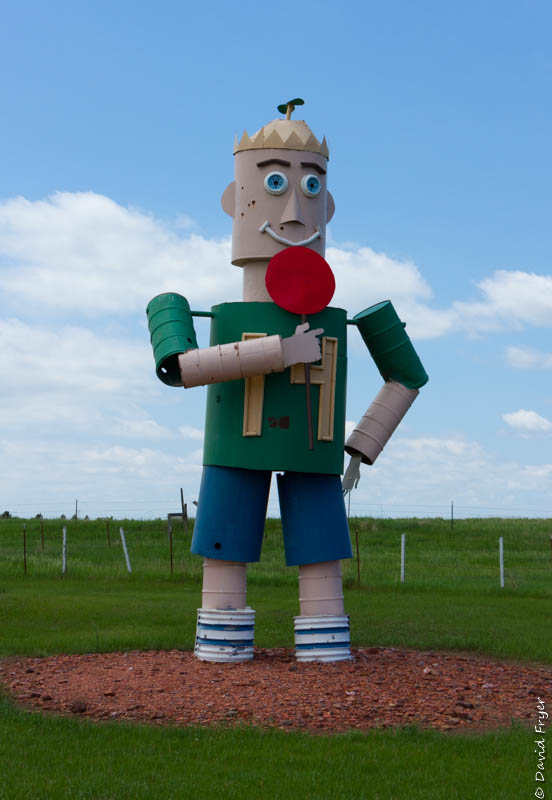 The next turnout is also the first sculpture erected on the highway. The Tin Family is built of used farm equipment. Tin Pa is the largest at 45 feet tall. It required 16 telephone poles to stand it up straight. Even the son is 23 feet tall. The farming family is only 1.5 miles from Regent. The tour concludes at Gary Greff’s hometown.
