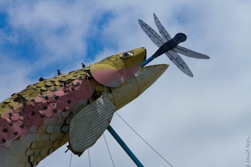 The Fisherman’s Dream was installed in 2006 and features fish found in North Dakota. These sculptures include bass, walleye, catfish, northern pike, salmon, and bluegill. The largest fish is a 70-foot rainbow trout which towers over the display.