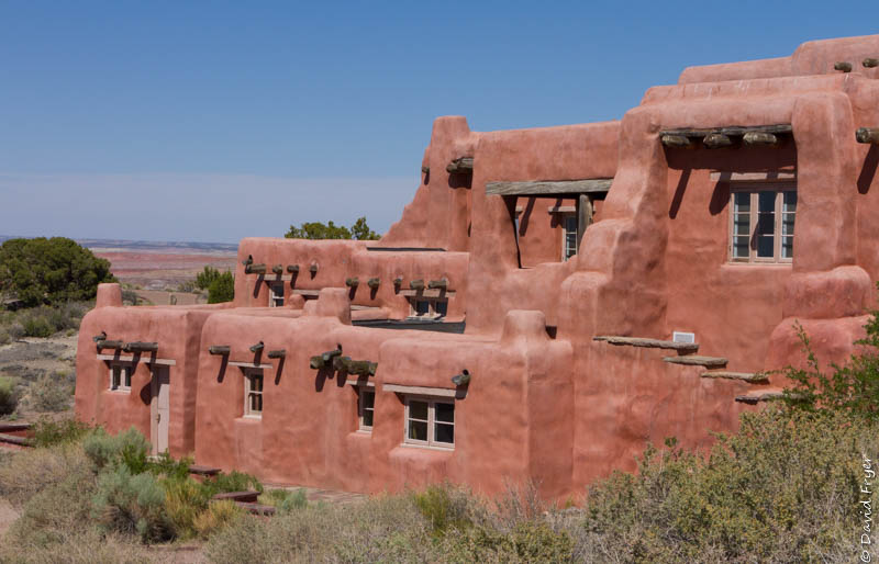The north entrance to the park is adjacent to Interstate 40 and is also near an historic inn. The Painted Desert Inn is a national landmark and has wonderful vistas of the painted desert. This structure is another one of the hundreds of contributions to the national park service by the Civilian Conservation Corp (CCC) in the 1930s. This adobe style building was refurbished by the CCC and is open for visitors. The foundation of the building is constructed of a most abundant local resource, petrified wood!