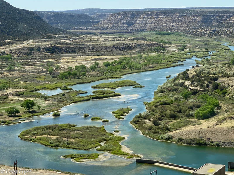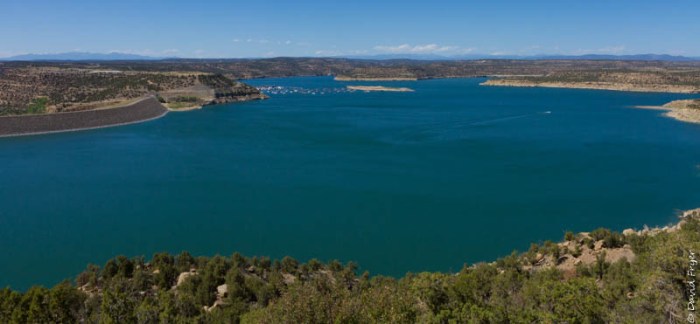 On our way back to Farmington, we drove by Navajo Lake which is the second largest lake in New Mexico. Built in 1962, this man-made lake is 25 miles long. An earth and rock dam that is 3800 feet long and 400 feet high holds back a reservoir that covers 1.7 million acres. We drove over the dam which was very spectacular. Unfortunately, the construction of the lake required the displacement of hundreds of families and the flooding of farm and ranch lands. Some of the Navajo Nation’s sacred sites also lie submerged beneath the lake.