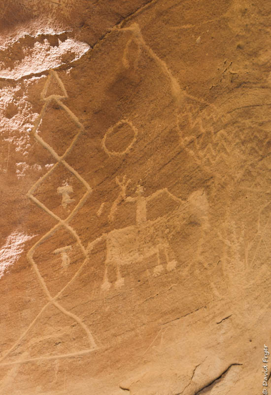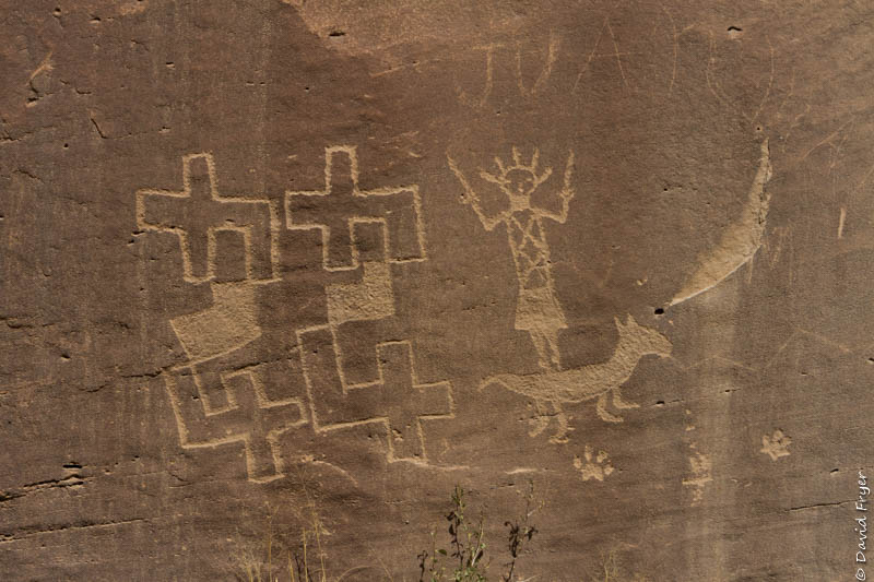 Crow Canyon has the greatest concentration of Navajo rock art in the southwestern United States. Hundreds of images of animals, plants, geometric shapes, and important persons to both the Ancestral Puebloans and Navajo people are organized into groupings called “panels.” These collections of petroglyphs are etched into the lower level of the rock wall so they are easily visible. Archaeologists believe that these panels were used as part of ceremonial activities or educational activities. They might have used them to teach the children or others about their history, culture, and traditions.