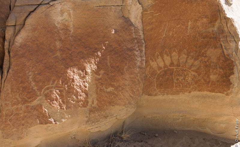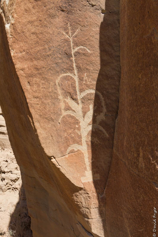 We saw three of the panels that were located on Bureau of Land Management (BLM) land in the canyon. The first was called “44 panel” because there is a petroglyph that appears to be an upside down and right-side up number “44.” To reach 44 panel, we had to hike about a mile from the parking area. The trail went down into a sandy wash that we followed for a while. The trail was not always marked and we were so glad that Glenn and Marsha knew the way. When we arrived, we were thrilled to see some amazing rock art. Many were in excellent condition given their age.