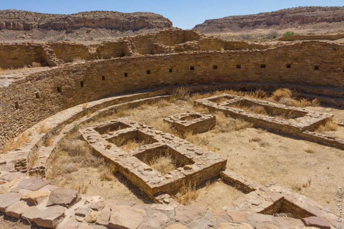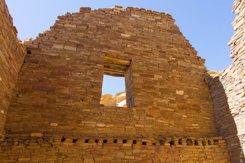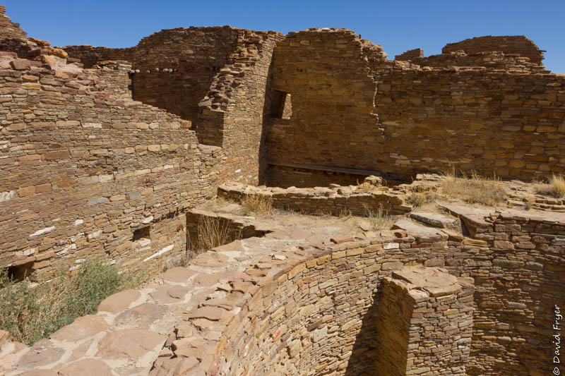 The stonework of the Chacoans progressed over the years and various building methods are on display in this one structure. You may have visited similar sites that contain one kiva. The Pueblo Bonito grounds boast 40 kivas! Kivas were used for worship, dance, prayer, public gatherings, and other purposes. These large round structures made of stone were covered by brick and wood roofs usually with a single hole in the middle for entry. Smoke from fires would also escape through this opening.