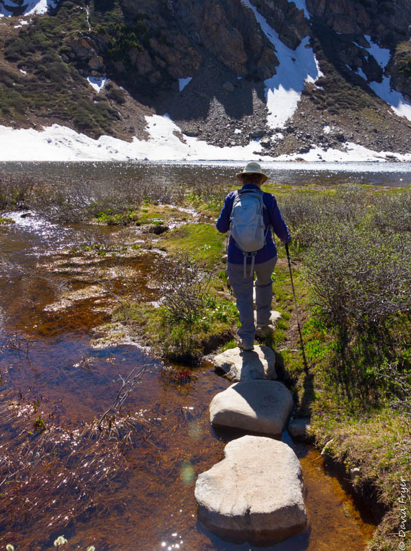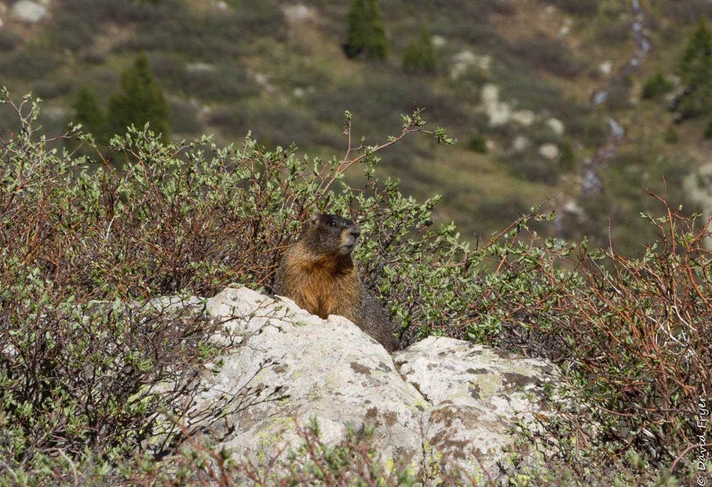 After spending some time soaking up the beauty of this summit, we continued on a bit farther toward Aspen. We were in search of the Linkin Lakes Trail in the Hunter Fryingpan Wilderness. We parked at the trailhead area for Linkin Lakes, Independence Lake, and Lost Man Lakes trails. We met several hikers who were returning from attempting to reach Lost Man Lakes but they had encountered thigh deep snow so they turned back. We chose a shorter 1.6 mile hike which for us was rather challenging due to the elevation gain and the elevation of the trail. We definitely had to stop multiple times to catch our breath but we did not mind since there were some amazing views of the mountains and valleys below. We did cross a snow field and several fast running streams on our way up to the lake. At the end of the trail, we were rewarded with a pristine alpine lake. While we rested and ate a snack before descending, a marmot stopped by to check on us. He was a very large marmot!