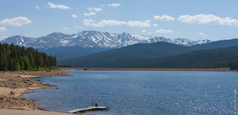 About 15 miles south of Leadville on Hwy. 82 are two lakes called Twin Lakes. These glacial-formed lakes are surrounded by beautiful mountains. The Twin Lakes are about 100 feet deep and cover about 4.2 square miles. Today both lakes are much deeper than they were in 1897. That year they built a dam to create a reservoir and they also dredged a canal between the two bodies of water to connect them. Later, in the 1970s they built the Mt. Elbert power plant to produce electricity. The U. S. Forest Service manages most of the land around Twin Lakes. Many people come to Twin Lakes for recreation like fishing, canoeing, kayaking, and hiking. There are five campgrounds and some dispersed camping around the lakes. We saw many fishermen and some kayakers out on the water while we were there.