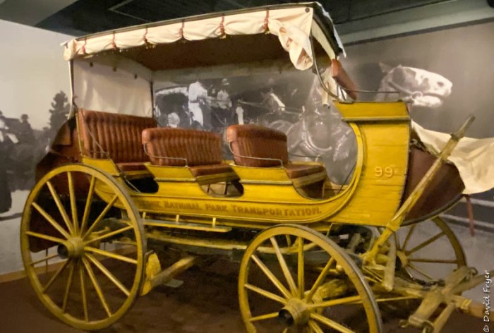 -The Yellowstone Wagon # 99 which was built in 1893 is on exhibit. This wagon transported tourists around Yellowstone. Drawn by four horses, it ferried eleven passengers into the park to see the sights.