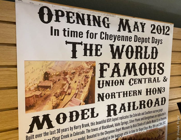 The third exhibit, located on the second floor of the museum, was a model train layout of Colorado’s Union Central and Northern Railroad. The hand-built narrow gauge layout was the creation of Harry W. Brunk. In 2011, he gave it to a friend, Rich Steeli, who donated it to the museum.