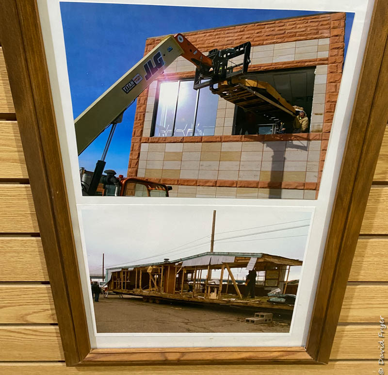 Brunk worked on this project for 30 years in a mobile home that had all its furnishings removed. The mobile home had been moved beside his house and when the train layout was relocated to the museum they hauled the entire mobile home to the depot! The outside walls of the trailer were removed to access the train display. After removing the large windows from the museum itself, forklifts placed the numerous sections of the model train layout in the building. The layout is the length of the second floor of the depot (65 ft. x 12 ft.). The docents operated the trains and were on hand to answer any questions. It was simply amazing to see this well researched train layout.