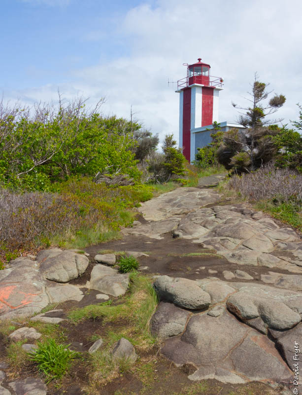 After a fire destroyed the first lighthouse, the replacement had the square shape with the red vertical stripes. The current building was declared a heritage lighthouse in 2015 and is now maintained by the Friends of Point Prim, a non-profit organization.
