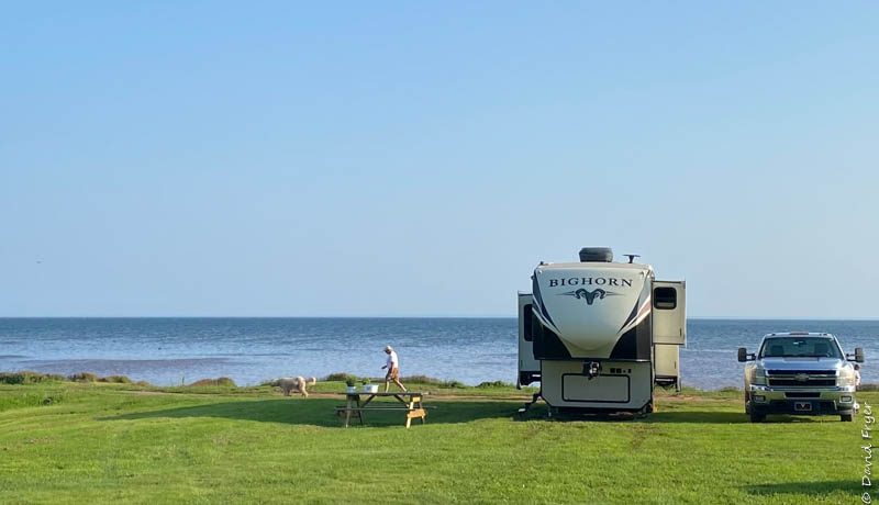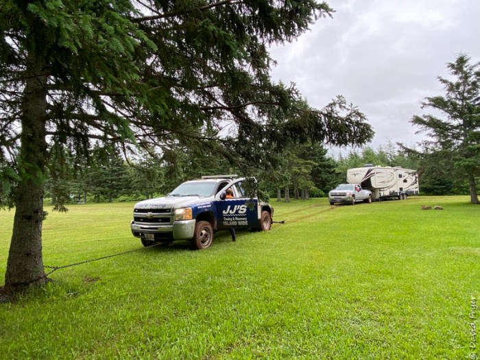We in turn moved south to the town of Summerside on Prince Edward Island. It was a short drive but I made a decision that ended up making it a long day. It had rained a lot, and the ground was soaked but I mistakenly thought we would be okay traveling on the grass at the provincial campground. I was wrong. Hours later being towed out by a tow truck driver who thankfully would not give up.